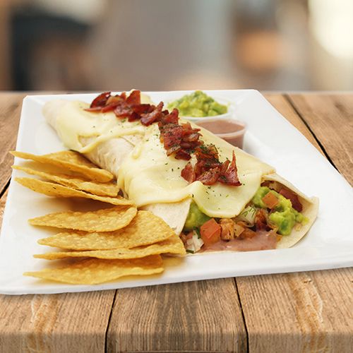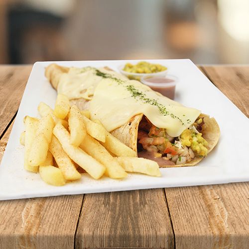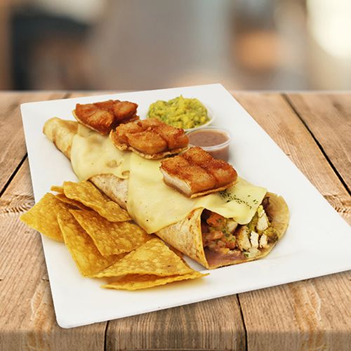 Carne, chorizo campesino, pollo, jamón ahumado, guacamole, pico de gallo y lechuga.