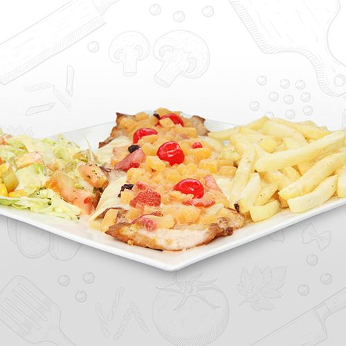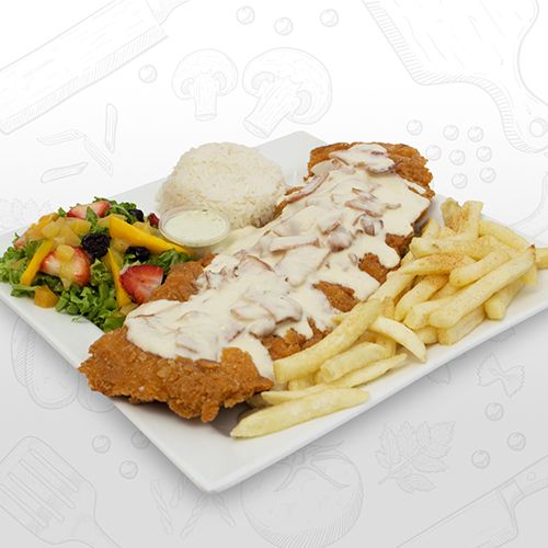 Exquisito lomo de cerdo apanado en salsa carbonara acompañado de ensalada, arroz y papas a la francesa.