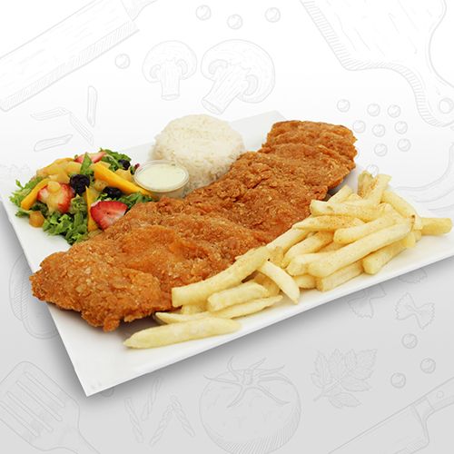 Exquisito lomo de cerdo apanado, acompañado de ensalada, arroz y papas a la francesa.