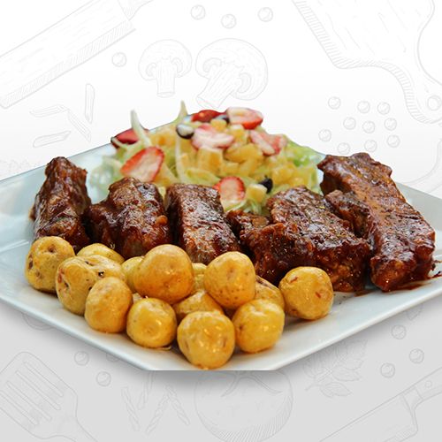 Deliciosas costillas de cerdo bañadas en salsa BBQ acompañadas de papa criolla, y ensalada.