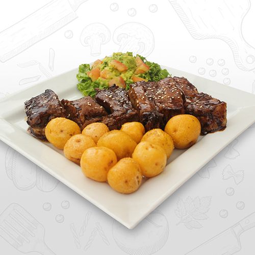 Deliciosas costillas de cerdo bañadas en salsa teriyaki y miel acompañadas de papas a la francesa y ensalada.