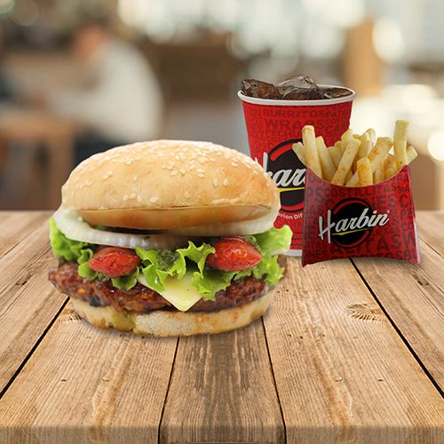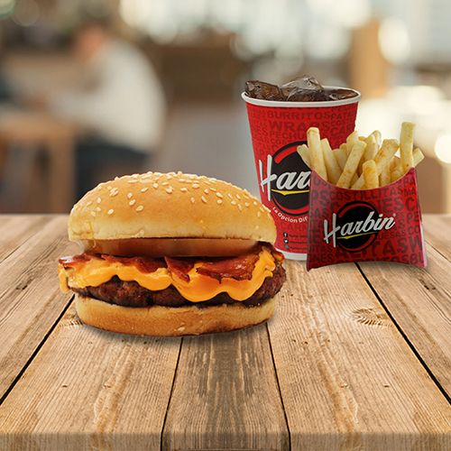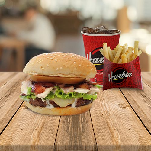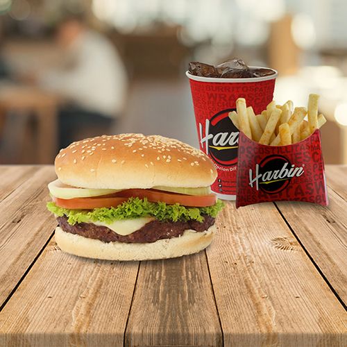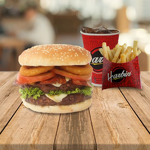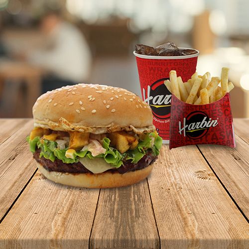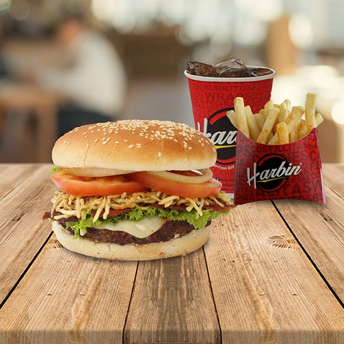 Carne 100% de res con queso, lechuga, tomate, cebolla y salsas.
