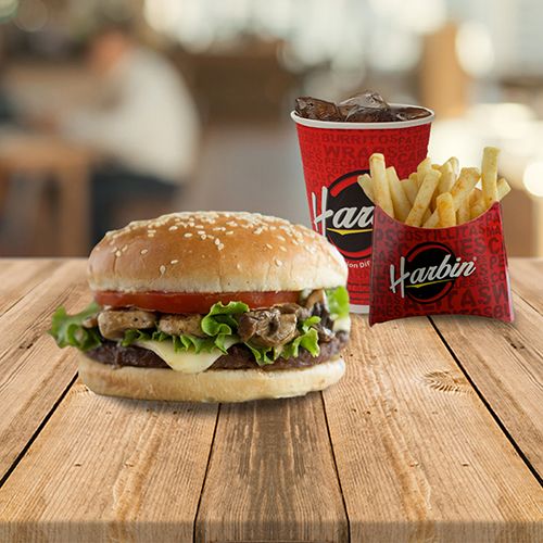 Carne 100% de res con queso, champiñones salteados, lechuga,tomate, y cebolla.