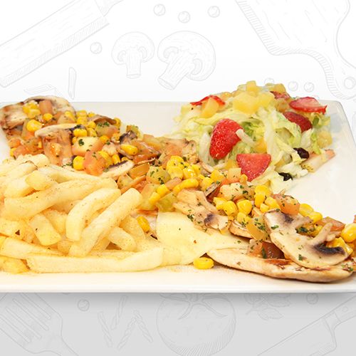 Exquisita pechuga con champiñones, tomate y maiz tierno salteados y gratinada acompañados de papa a la francesa o croquetas de yuca y ensalada.