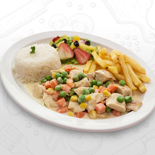 Delicioso pollo cortado en cubos en salsa bechamel con vegetales acompañada de papas a la francesa y ensalada.