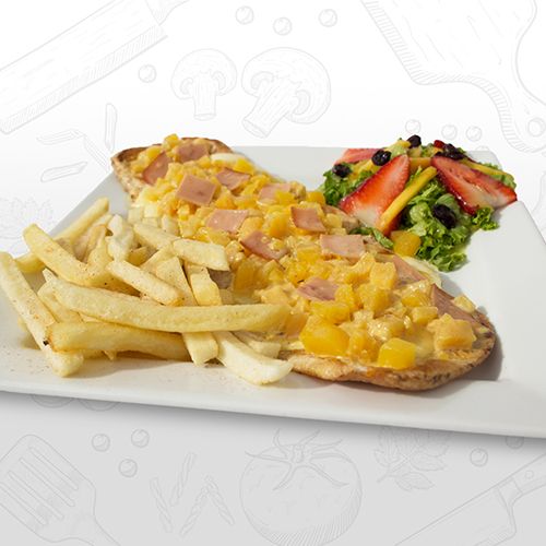 Deliciosa pechuga gratinada en una delicada salsa hawaiana (jamón,piña) acompañada de papas a la francesa y ensalada.