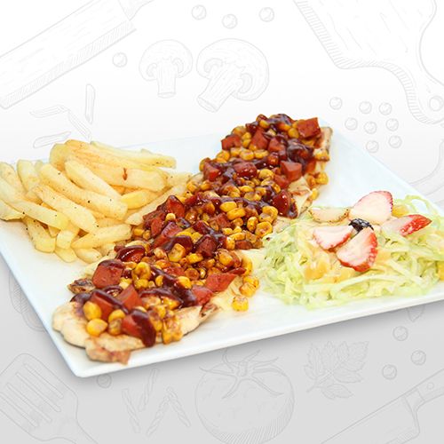 Deliciosa pechuga gratinada con chorizo y maiz salteados con un toque de salsa BBQ acompañada de papas a la francesa y ensalada.