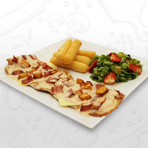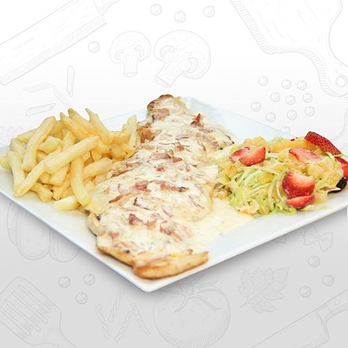 Deliciosa pechuga gratinada en salsa carbonara con tocineta acompañada de papas a la francesa y ensalada.