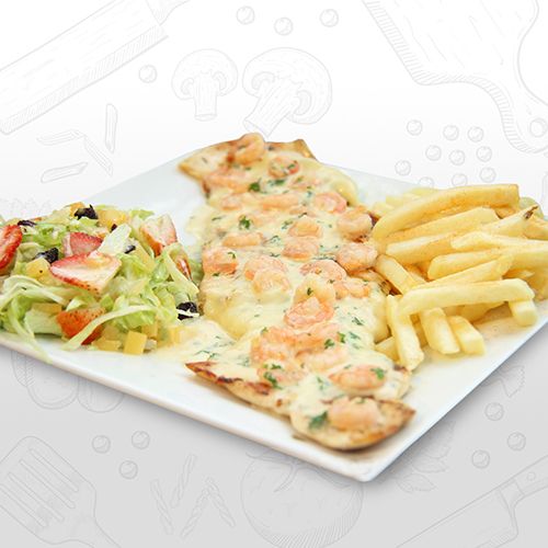 Deliciosa pechuga gratinada en salsa de camarón acompañada de papas a la francesa y ensalada.