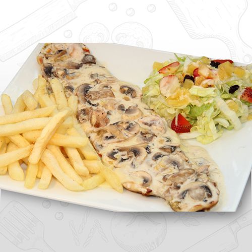 Deliciosa pechuga gratinada en salsa de champiñones acompañado de papa a la francesa y ensalada.