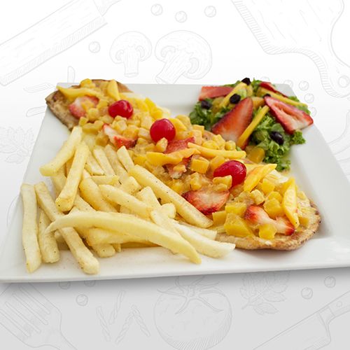 Deliciosa pechuga gratinada en salsa tropical(cerezas, piña en trozos, fresas y ciruelas pasas) acompañado de papa a la francesa y ensalada.