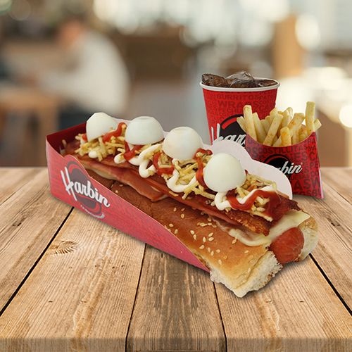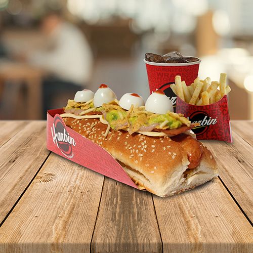 Salchicha americana, queso, jamón , tocineta, huevo de codorniz y variedad de salsas.